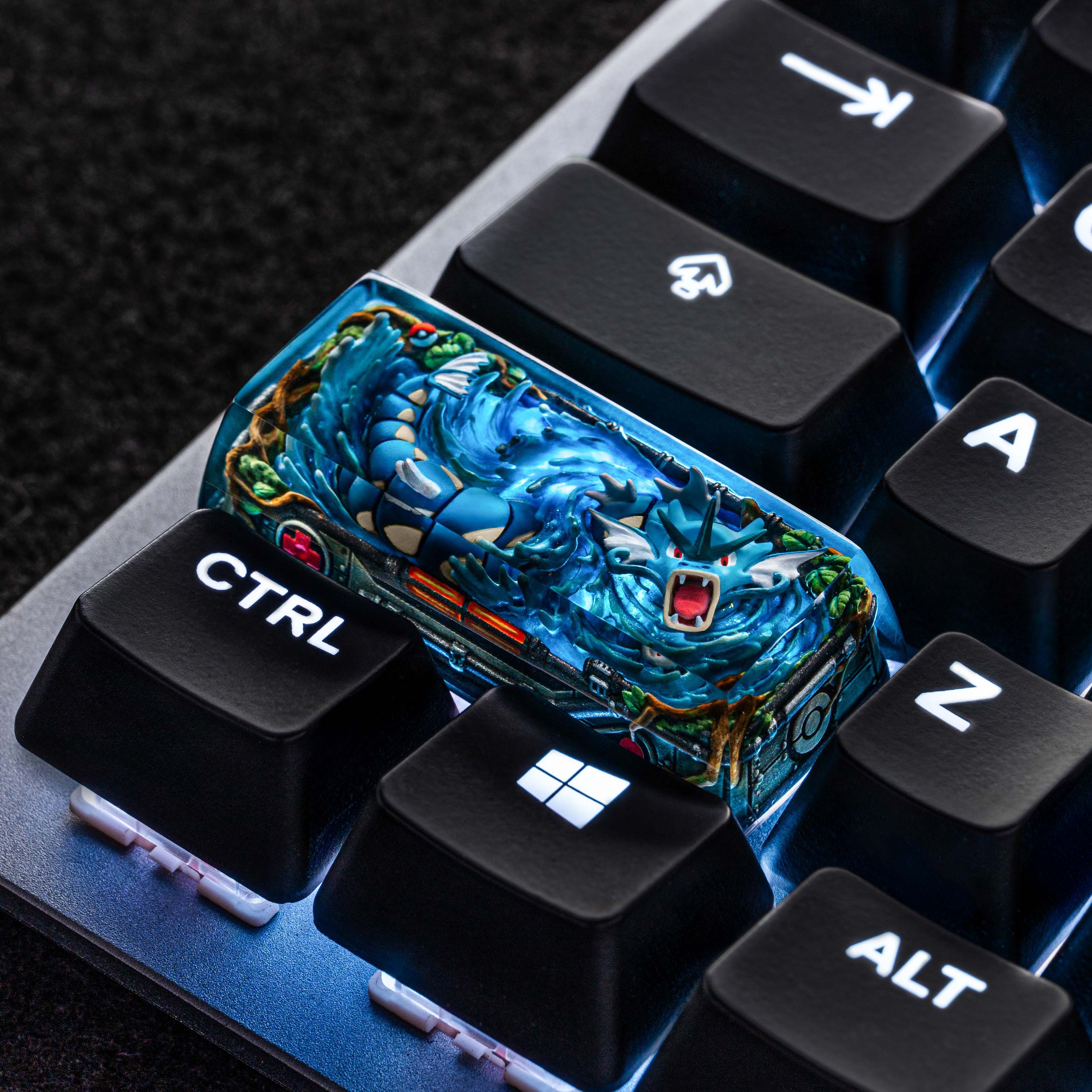 Gyarados embodies raw power and unrelenting fury with its serpentine form and piercing gaze. Known as the Atrocious Pokémon, Gyarados channels its immense strength to create devastating storms and tidal waves, striking fear into those who dare to challenge it. Its transformation from the humble Magikarp into a mighty force of nature is a testament to resilience and evolution. Inspired by its legendary might, this artisan keycap brings a surge of power and intensity to your keyboard setup!